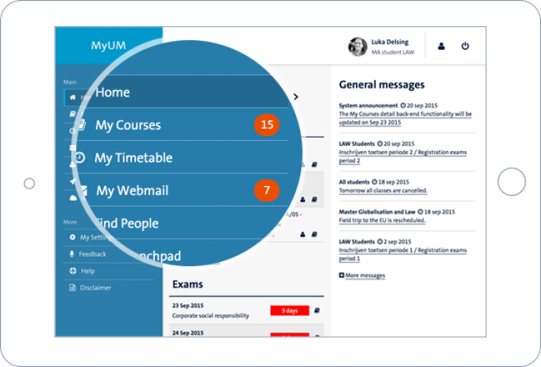 In de rode stip staan het aantal berichten die een student nog niet gelezen heeft. Om dat te realiseren is de integratie van vier back-end-systemen nodig. Een technisch kunststukje waarbij de designer een centrale rol speelt als consultant, verhalenverteller en project owner. Verschillende afdelingen en externe bureaus moeten samenwerken om dit in de uiteindelijke portal te krijgen. Na maanden werk is het eindelijk gelukt. Het werkt. Deze week hebben we echter besloten de stip te verwijderen. Een typisch geval van kill your darlings. De rode stip staat symbool voor de nieuwe digitale service die we aan de studenten van de UM willen bieden: de student is altijd op de hoogte van de nieuwste berichten rondom zijn studie. Het is de kers op de taart van de integraties die onder water plaatsvinden. En toch moet hij weg.