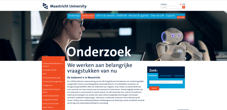 Met een wereld die steeds verder digitaliseert besteedt Universiteit Maastricht uiteraard ook aandacht aan online presence en digital servicedesign voor diverse doelgroepen. We verzorgden de vormgeving van de website en introduceerden cinematographs (bewegende foto's) voor de headers. Daarnaast bedachten we een drievoudige navigatiestructuur om de duizenden webpagina's op logische wijze te ontsluiten.