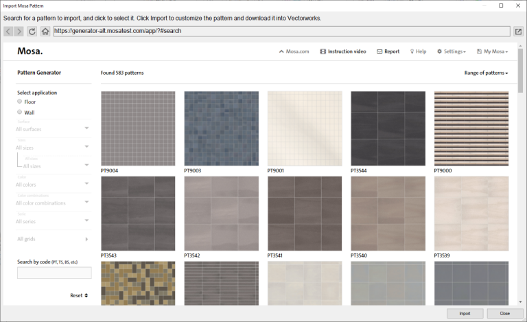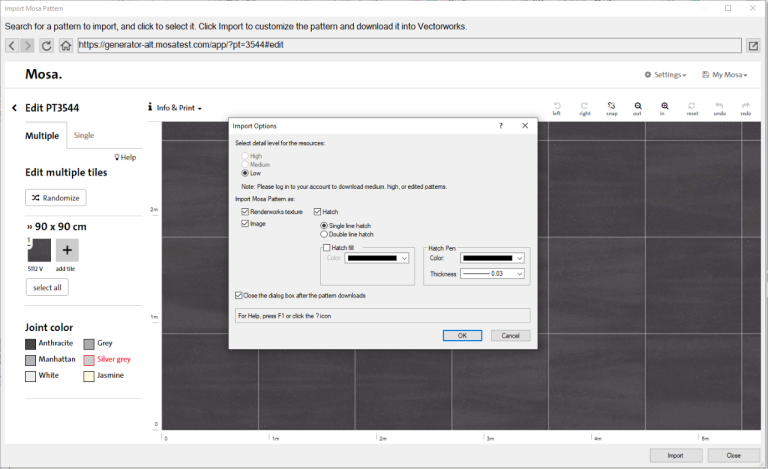 Vectorworks had op dat moment al de eerste stappen voor optimalisatie gezet. Er waren echter wijzigingen in de webinterface van de Mosa Pattern Generator nodig. Tijdens een videocall hierover begonnen bij ons de ideeën te borrelen. Was het niet veel logischer om de import geheel te regelen binnen de Vectorworks interface? Oftewel een verdere integratie dan de voorgestelde optimalisatie.