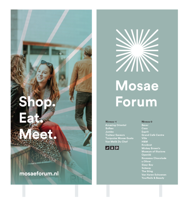 Het Rotterdamse PR-bureau Syrinx, dat gespecialiseerd is in vastgoed, verzorgt de marketingstrategie voor winkelcentrum Mosae Forum. Zij zochten een lokale designpartner om de nieuwe propositie 'Shop, Eat & Meet' visueel te laten landen. Tegen zo'n uitdaging zeiden wij natuurlijk geen nee. Het resultaat is een grafische en optimistische stijl die sinds vorig jaar in het straatbeeld te zien is.