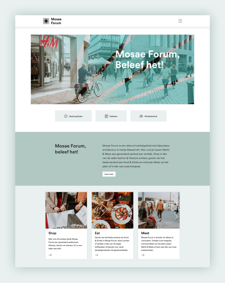 Het eerste middel dat we in de nieuwe stijl uitvoerden was www.mosaeforum.nl. Na het maken van een uitgebreid UX/UI ontwerp werd de website gebouwd en opgeleverd. Daarnaast maakten we o.a. informatieborden, tasjes en kaarten voor Mosae Forum. Buiten ons zijn er uiteraard ook nog andere creatieven in de weer met de uitrol van dit project.